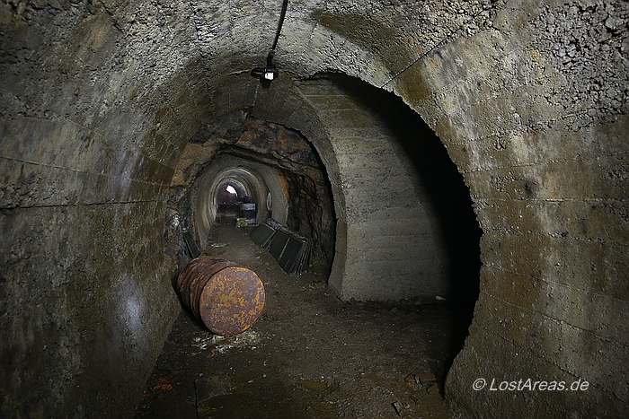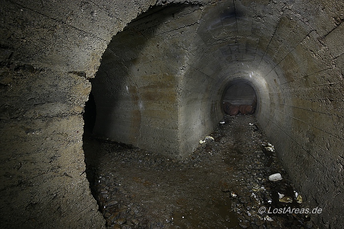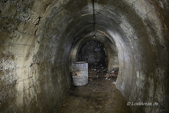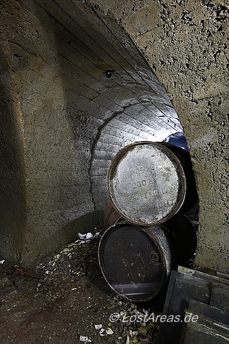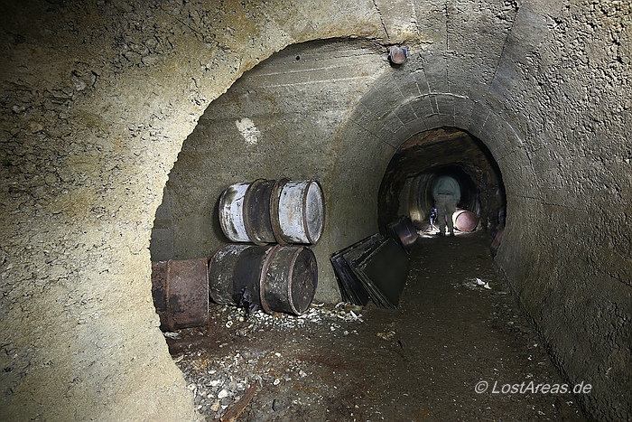Ein kleiner eher uninteressanter Luftschutz-Stollen, in dem einige 200L Kraftstoff-Fässer der Wehrmacht lagern. Es kann davon ausgegangen werden, daß die Fässer seit 1945 hier eingelagert sind. In einem anderen Bereich des Stollens befinden sich 20L Kanister der Wehrmacht - allerdings nur vereinzelt, in sehr schlechtem/ unbrauchbaren Zustand und mit anderem Schrott vermengt. |